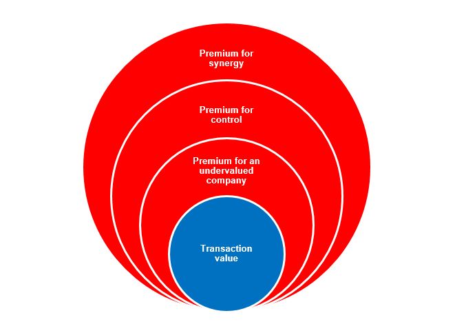The Blue area is what you pay for. The red area is what you got (or you at least try to achieve). As long as there is some red area (for example, transaction value can be higher than presented in this graph and include some of the presented premiums), your acquisition makes sense.